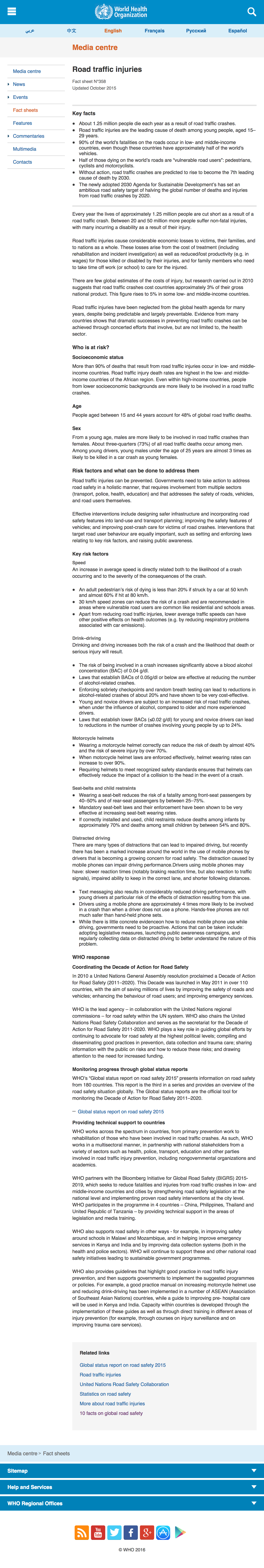 From a young age, males are more likely to be involved in road traffic crashes than females. About three-quarters (73%) of all road traffic deaths occur among men.